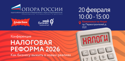 Хабаровское региональное отделение «ОПОРЫ РОССИИ» совместно с Центром «Мой бизнес» Хабаровского края и АО «АЛЬФА-БАНК» проводит практическую конференцию «Налоговая реформа 2026: как бизнесу выжить в новых реалиях».