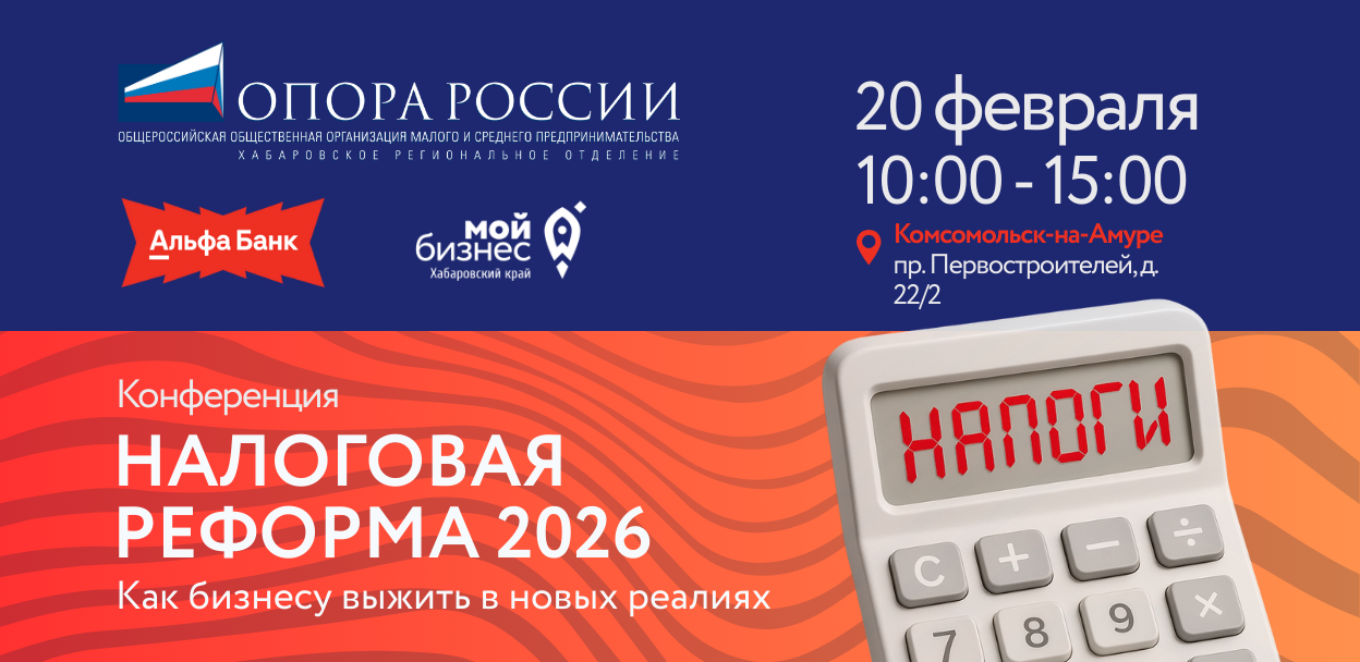 Хабаровское региональное отделение «ОПОРЫ РОССИИ» совместно с Центром «Мой бизнес» Хабаровского края и АО «АЛЬФА-БАНК» проводит практическую конференцию «Налоговая реформа 2026: как бизнесу выжить в новых реалиях».