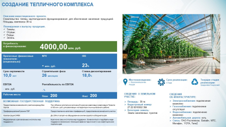 Проект включает в себя строительство теплиц круглогодичного функционирования для обеспечения населения здоровыми продуктами в независимости от сезона года и повышения продуктовой безопасности региона.